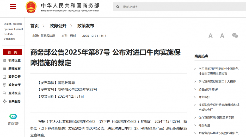 《商务部公告2025年第87号》指出:调查机关裁定,进口牛肉数量增加,中国国内产业受到严重损害,且进口产品数量增加与严重损害之间存在因果关系。 商务部根据调查结果,决定以"国别配额及配额外加征关 ...